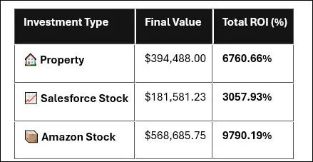 Over the past two decades, my modest initial investment of $5,750 in real estate has grown into nearly $400,000 in total gains—a testament to the compounding power of time, equity, and appreciation. While high-performing stocks like Amazon and Salesforce have also delivered impressive returns, real estate offers a unique blend of tangible value, leverage, and stability that can rival even the most dynamic equities.